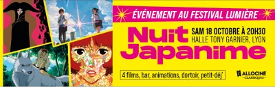 Description | Nuit Japanime... Au Festival Lumière Une nuit, une salle géante, 4 chefs-d'œuvre de l'animation japonaise ! Une ambiance unique, avec de nombreuses surprises, Une grande librairie manga organisée avec Momie Lyon, Un petite déj' offert et un dortoir pour faire une pause. À édition exceptionnelle, Nuit exceptionnelle. Cette année, le Festival Lumière vous propose une nuit aux confins du rêve, de l'imaginaire, du fantastique et de la réalité, avec quatre chefs-d'œuvre du cinéma d'animation japonais. Princesse Mononoké, la grande fresque de Hayao Miyazaki ; Your Name, splendeur contemporaine déjà culte ; Belladonna, rareté psyché 100% 70's à découvrir d'urgence ; et Paprika de Satoshi Kon, véritable Mulholland Drive de l'animation. "Princesse Mononoké" de Hayao Miyazaki (1997, 2h13) "Your Name" de Makoto Shinkai (2016, 1h47) "Belladonna" de Eiichi Yamamoto (1973, 1h26) "Paprika" de Satoshi Kon (2006, 1h30). Horaires : Les samedi 18 et dimanche 19 octobre : à partir de 20h30. Tarifs : Série 1 : 25 €. |